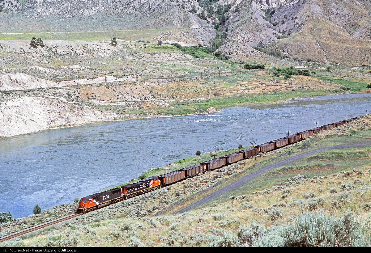 | A CN empty coal train rolls east along the Thompson River between Black Canyon and Ashcroft, BC. CP's main is across the river. The two railroads do not normally share trackage at this location, but start shared trackage through the canyons a few miles west of here. |