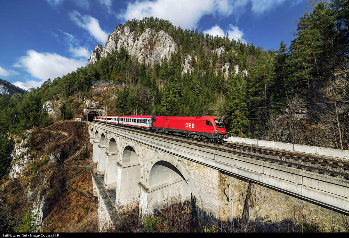 | Winter has gone several days ago: railjet 533 bound for Villach clears Semmering pass in the morning of an early spring day. The intercity coaches and Taurus are hanging on the rear of the train every day. Photo taken at Krauselklause viaduct just after Breitenstein. |