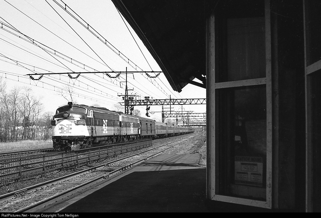 New Haven train #19, the Boston-New York Mayflower, hustles past the station at Stratford, CT, behind the usual pair of FL9s during the New Haven's last year.