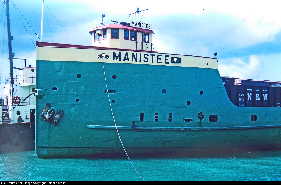 During the summer and fall of 1965, while the CHIEF WAWATAM, the regular rail ferry between Mackinaw City and St. Ignace, Michigan was in Manitowoc, Wisonsin for a boiler rebuild, the rail barge MANISTEE and the tug MUSKEGON were chartered to temporarily handle the task of moving rail traffic across the Straits of Mackinac. Built in 1898 as ANN ARBOR FERRY NO. 2 the vessel operated for many years in Lake Michigan service. Near the end of its life it was converted into a barge powered by a tug and was renamed MANISTEE.