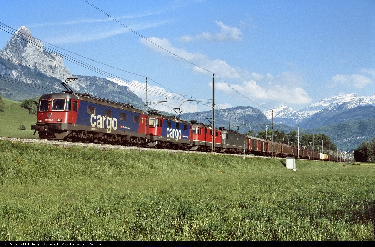 | SBB Cargo Re 620 065-3 "Ziegelbrücke / Schänis Niederurnen", Re 421 394-8, Re 4/4 II 11338 and Re 6/6 11646 "Bussigny" with a northbound freight.