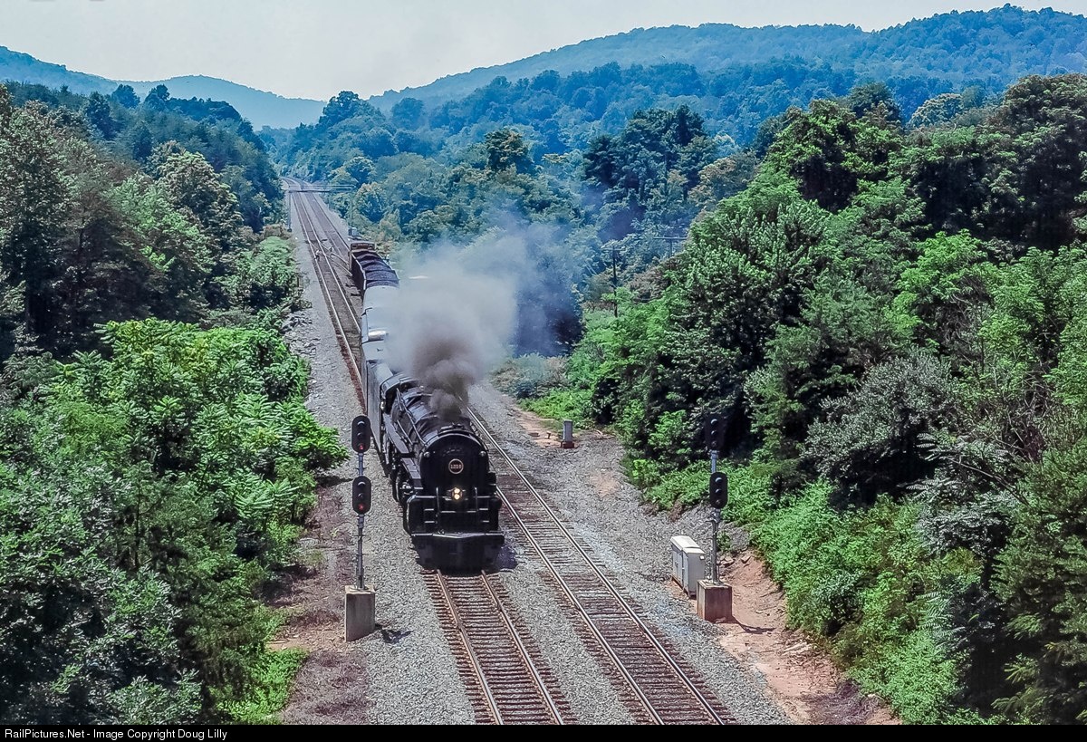 Continuing its non-excursion trip from Roanoke to Charlottesville, Virginia, N&W A-class 2-6-6-4 1218 nears its destination. Pulling a pair of tool cars, and five hoppers to be left in Charlottesville, the big articulated is leading a mixed train one the Southern main line at Teel, Virginia.