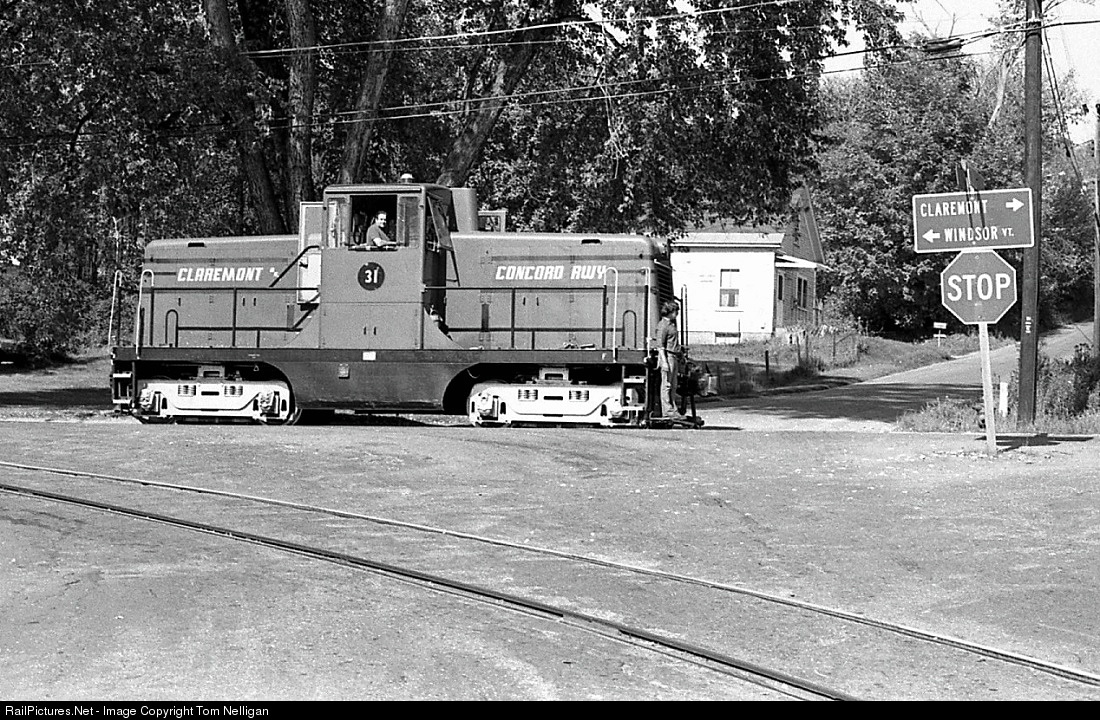 Should the crew of Claremont & Concord 31 forget how to get home, they can always refer to the handy road sign. Their GE 44-Tonner is switching former Claremont Railway street trackage, once a trolley line, at the far end of the C&C's West Claremont branch.