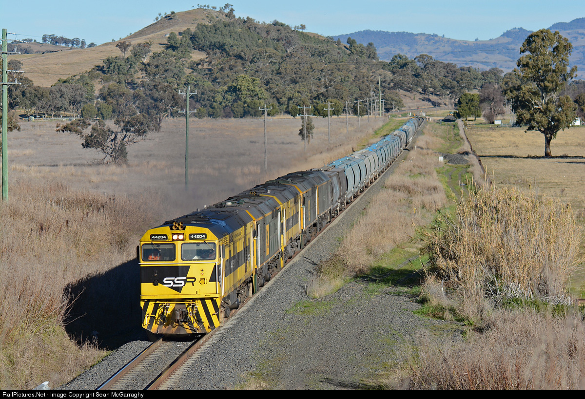 SSR's northern grain trains are regularly producing 5 plus locomotives on each train. Here at the Kamilaroi Hwy overpass between Willow Tree and Braefield, 44204, 442s1, 44206, 442s5 & RL304 work 4547N empty grain from Port Waratah to Moree.