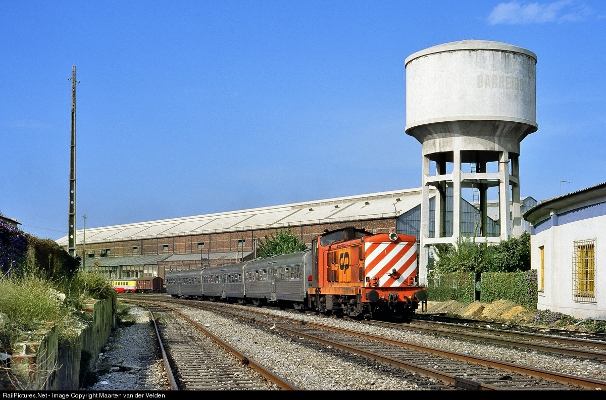 | CP 1463 has just left Barreiro station with SUB. 17209 from Barreiro to Praias-Sado and passes the water tower of the sheds of Barreiro.