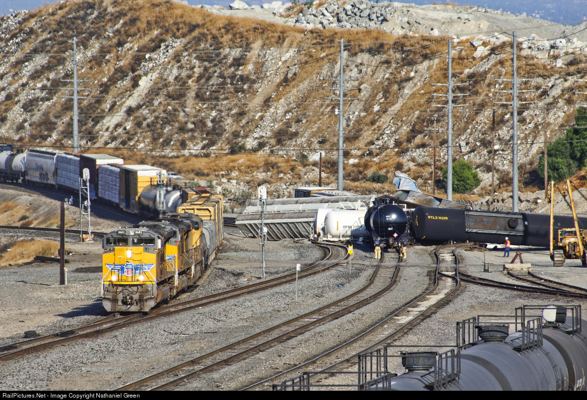 Not a good way to start the afternoon. A UP trim job derailed earlier that afternoon. Several cars are off the ground and the tracks are torn up. Several trains waiting to leave to leave the yard are now trapped.