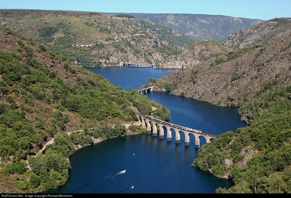 | Intercity Clermont-Ferrand – Nìmes is crossing the Altier Viaduct (length 257m, 843ft) above Lake Villefort. Probably it was the last summer with a locomotive hauled train on this line. |