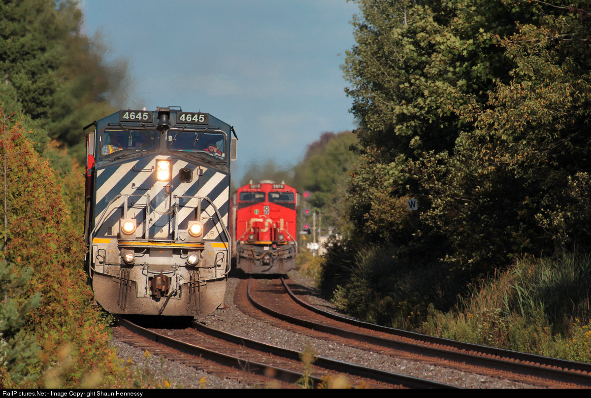 | CN 369 with a classic BC rail blue leader takes the curve out of Newtonville going into the sun as the tail of a eastbound loaded Potash train fades into the back. Making a head to tail pass with the potash train having 2 units on the head, one mid and the rear dpu as seen! |