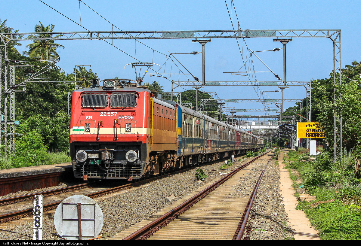 ERODE WAP-4, fresh from overhauling, powering Kannur bound Jan Shatabdi Express rushing through Kadakkavur station