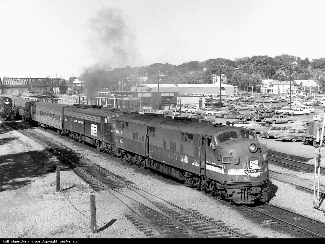 Penn Central train 72, a Buffalo-New York Empire Service run, gets underway for Grand Central out of the original Albany-Rensselaer station behind a pair of E-units. Tired-looking E7 4030 is an ex-NYC unit with both PC and NYC heralds on its nose, while ex-PRR E8 4251 at least has a fresh coat of paint. You won't find any SUVs in that 1970 parking lot!