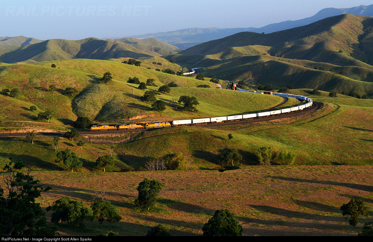 | A UP intermodal from the shipping port of Brooklyn, Oregon curves it's way up through Allard and into the horseshoe in the very early moments of sunlight on this perfect spring morning. |
