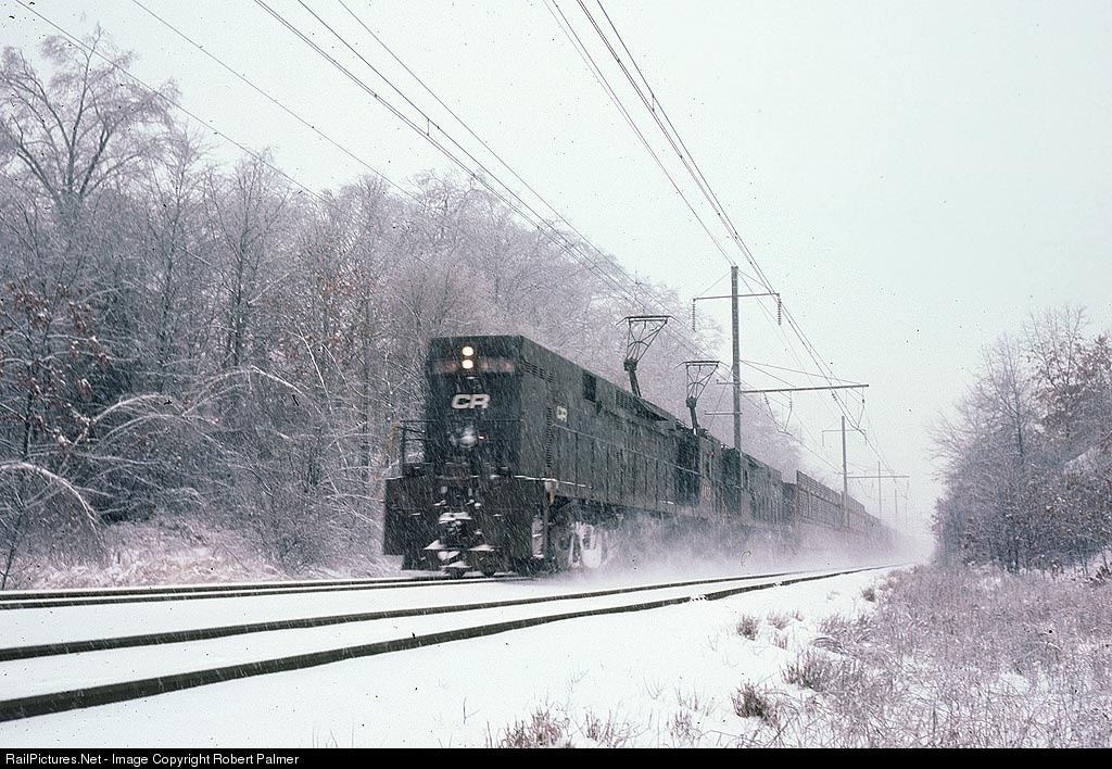 | In one of my first photos as a young teenage railfan, a pair of Conrail E44 electrics speed eastbound through a heavy snowstorm. The train is operating on the '"Trenton Cut Off', a 48 mile line built by the PRR to allow trains between North Jersey and Harrisburg to bypass Philadelphia |