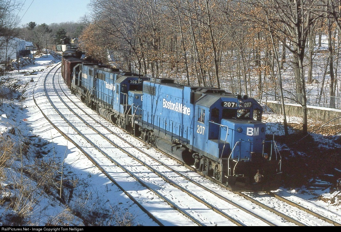 On a late winter afternoon, an eastbound Boston & Maine freight coils through North Leominster, MA, on its way from Mechanicville, NY, to Portland, ME, behind a GP38-2/GP40-2/GP38-2 trio. New welded rail has been dropped along the eastbound track, which is out of service as a crew works a few miles away.