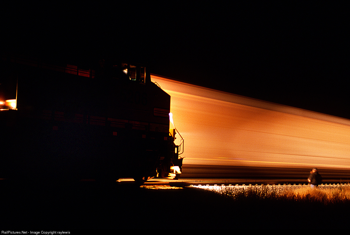 In the fall of 2005 an Southound BNSF was stopped at Sandcut, CA. In the foreground the conductor of BNSF 4239 watches a Northbound pass by as the hr approaches midnight.