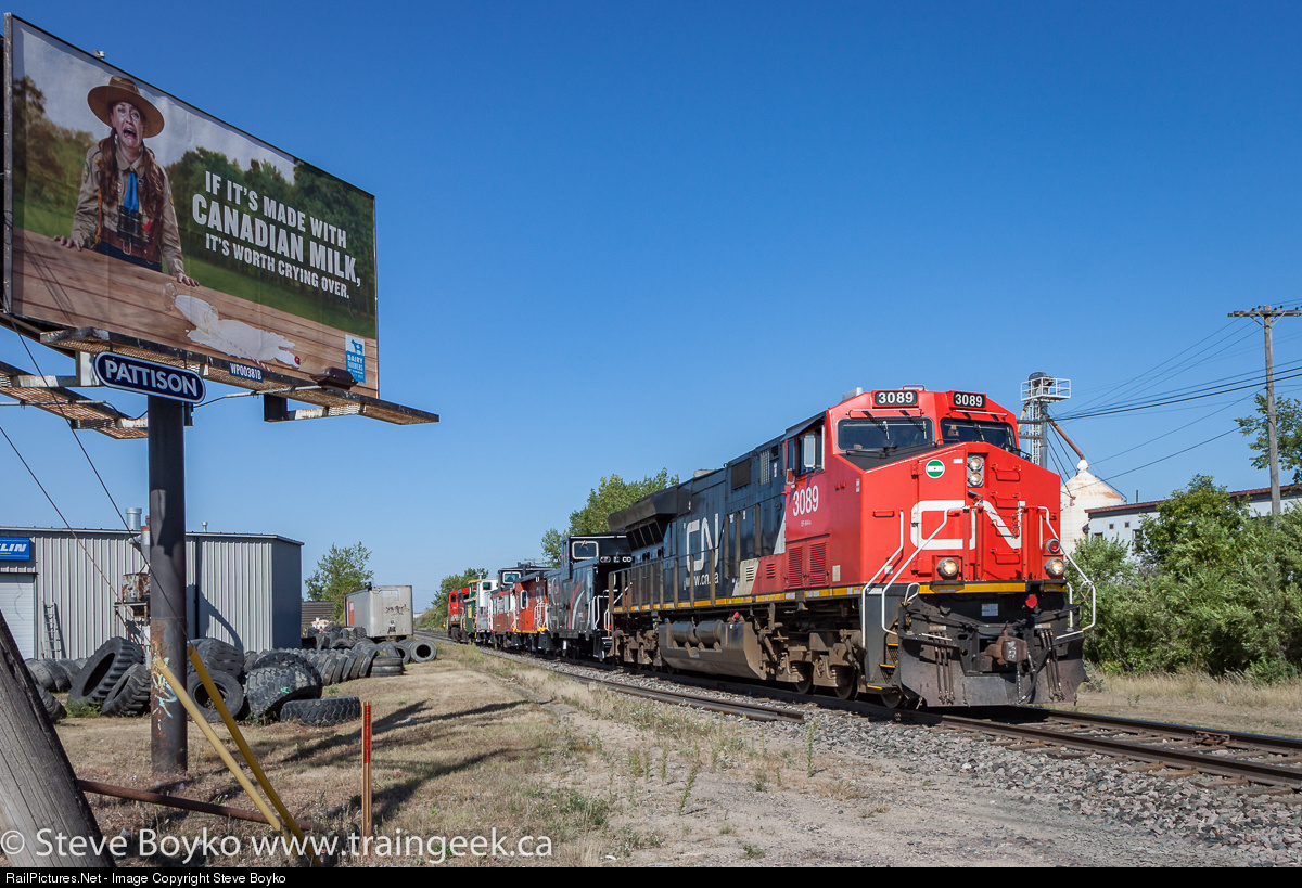 There was no crying on CN's Family Day train as it passed the latest milk ad on the St. Boniface spur in Winnipeg. This train had five cabooses sandwiched between two CN locomotives.