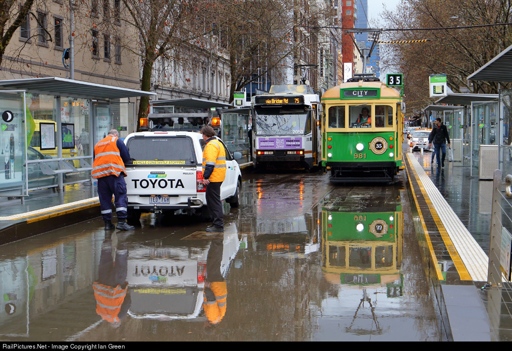 | Following an afternoon downpour, W8 class tram 981 waits for maintenance staff to clear a blocked drain in Flinders Street at Market Street. |