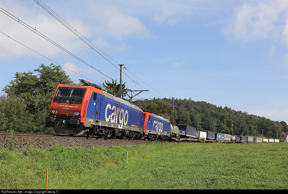 | Re 474 # 012 and # 005 of the SBB are pulling a long intermodal train from Singen via Schaffhausen-Eglisau-Regensdorf-Olten-Lötschberg-Simplon to Domodossola. This is a rerouted train because of the line interruption near Rastatt/Germany for several weeks. |