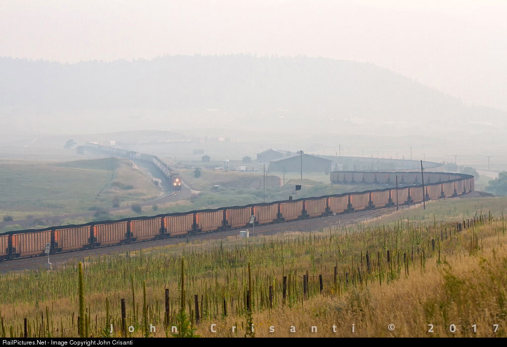 | Thick smoke from numerous wildfires fills the sky creating hazy atmospheric conditions. A loaded BNSF coal train waits in the sag at Spruce just north of Palmer Lake, Colorado on Main 1 as the Belen-Denver manifest starts its descent from the Palmer Divide towards Denver on Main 2 on September 4, 2017. |