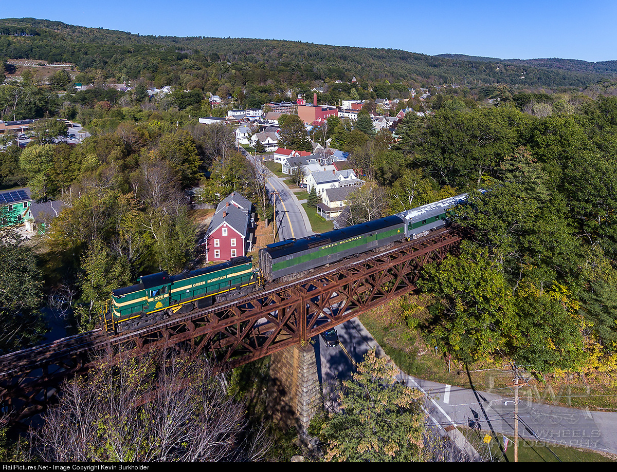 The Green Mountain Railroad Foliage Passenger Extra is seen on the bridge over Route 100 in Ludlow, Vermont, on Sunday, October 1, with veteran ex-Rutland RS-1 (GMRC) 405.
