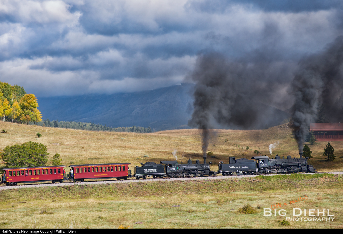 | Overcoming gravity on one, if not the steepest railroad in the country, Rio Grande Southern 455 and Cumbres and Toltec 487 climb out of The Chama River Valley (which extends into the backdrop) towards Cumbres Pass on a brisk fall day. |