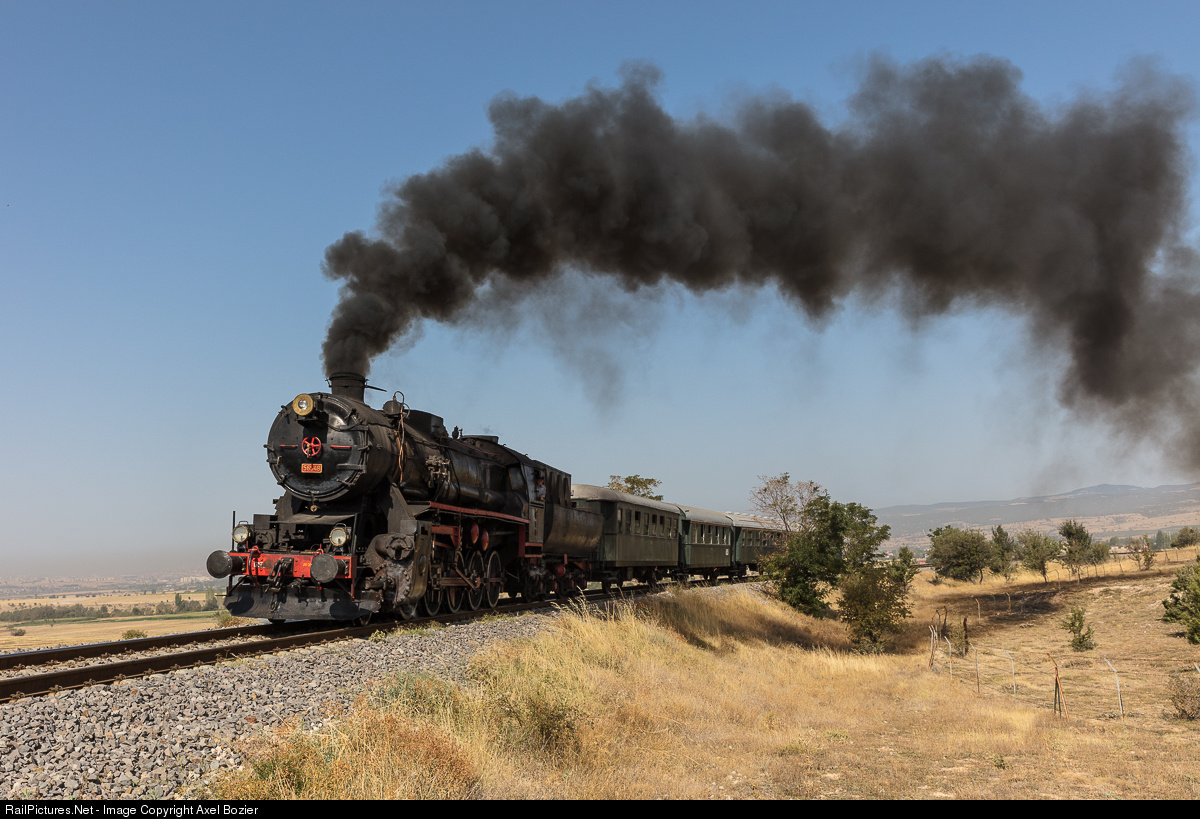 | The Decapod #56 548 of the Turkish Railway TCDD with its passenger train charging south of the city of Uşak, where this locomotive was based. |