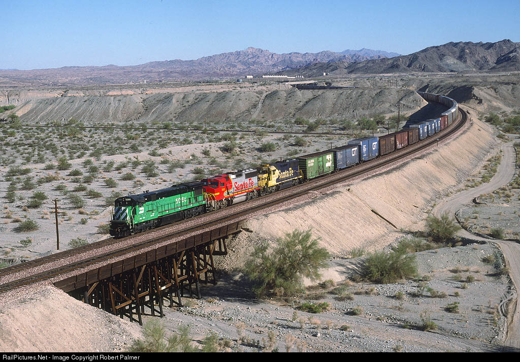 | A BN C30-7 in the desert. Displaced from coal service by the ubiquitous SD70MACs, older worn out BN power found its way to the Santa Fe. Here, the BN green contributes to a colorful trio in charge of a hot vehicle train. The train has just entered California and is approaching a crew change at Needles. |
