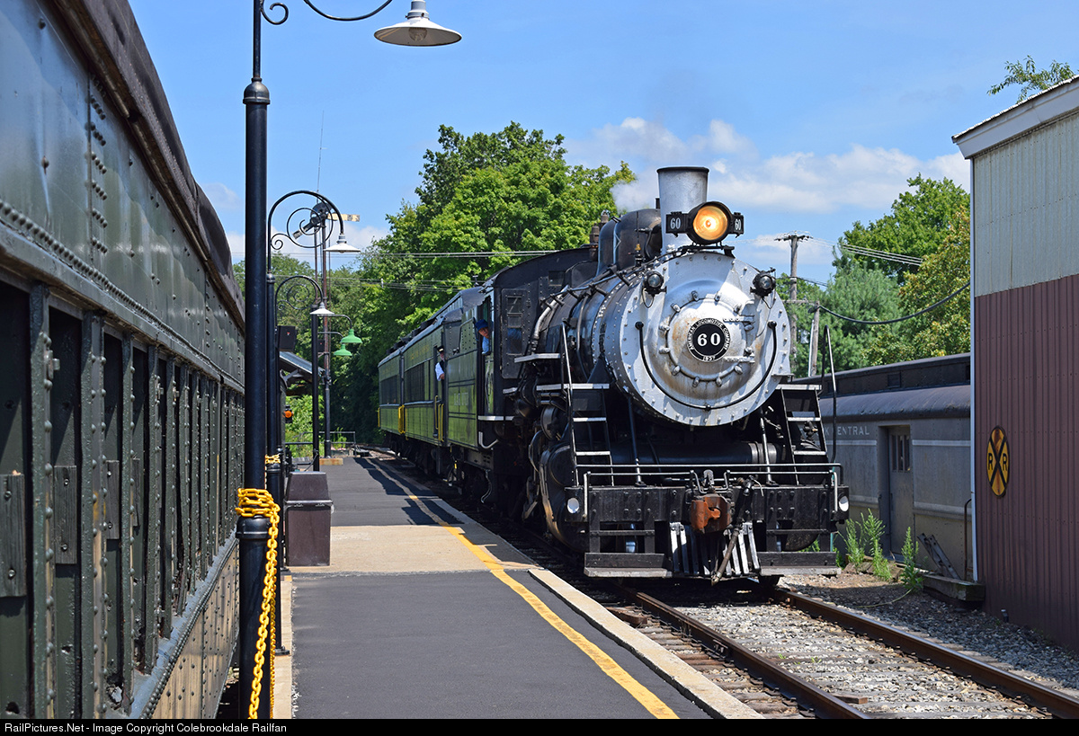 | Pulling back into Ringoes from Flemington, Black River & Western's number 60 slows to a stop to discharge passengers. Because of a lack of a siding in front of the station, the crew will run around the coach and combine in the yard. |