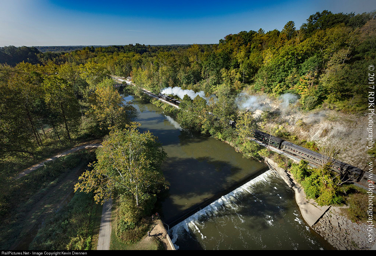 Nickel Plate 765 rolls through Brecksville, Ohio on the Saturday of the last weekend of CVSR's Steam in the Valley excursions. Shot overhead from Route 82 overpass bridge which soars 145 feet in the air. No this is not a drone shot.