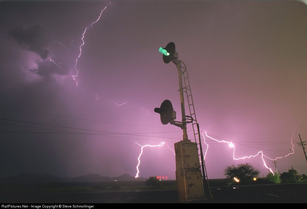 Vivid lightning rips through the sky over the Tortolita Mountains as an eastbound UP freight activates the CTC signal at the west end of Rillito.