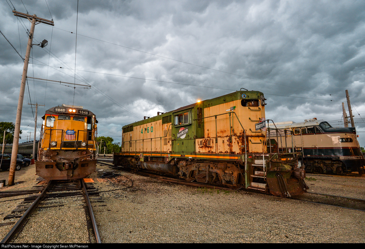 A stormy night approaches as IRM's Diesel Shop is busy prepping engines for the upcoming weekend event "Diesel Days 2016." UP 1848 and BN-3 idle alongside CNW 4160, which is currently being restored to CRIP 4506 by IRM volunteers.