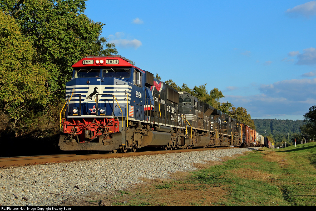 NS SD60E #6920, the Honoring Our Veterans Heritage Locomotive, along with the New York Central Heritage Locomotive & a couple of regular NS GE Wide cabs are in charge of Westbound Train 187, they are seen here passing through Leeds, AL. On their way Norris Yard in Irondale, AL.