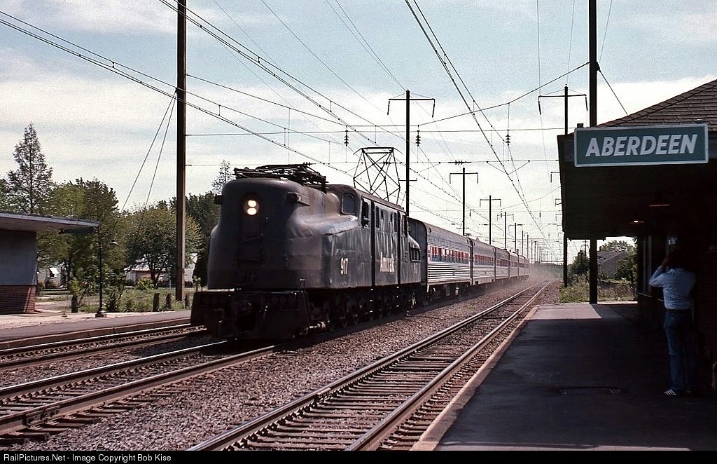 The 917 is trailing a stream of dust as it speeds up the center track by the old PRR station in Aberdeen. It's 1977, and there's still a lot of the "old NEC" in existence- all wood ties, Heritage equipment, and Penn Central Deepwater Green station signs. The 917 still survives; it was built by Altoona/Westinghouse in July 1942 as the PRR 4919, retired by Amtrak after 5.5 million miles, and is today preserved at the Virginia Museum of Transportation in Roanoke.