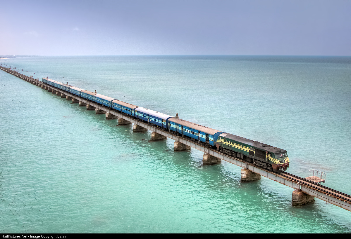 | Tiruchirapalli-Rameswaram passenger over 2 Kilometers long Pamban railway bridge. Speed limit on this more than 100 years old bridge is just 15 kms per hour. |