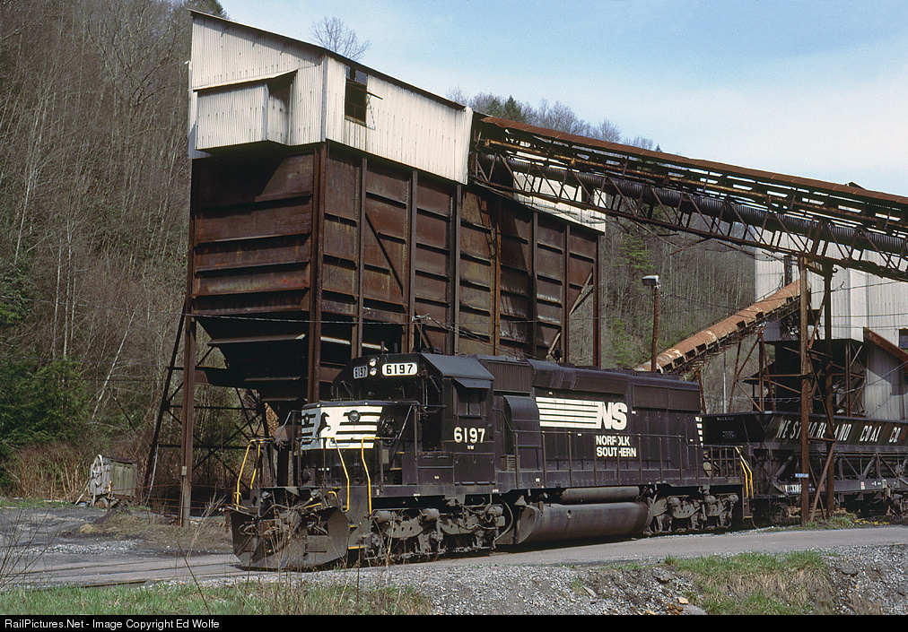 The J01 dump train has unloaded at Wentz, located a short distance to the right, and slowly rolls past the idled Osaka No. 2 tipple at Stonega. The crew will return to Holton, located on a spur off the ex-Southern's St. Charles Branch, for reloading.