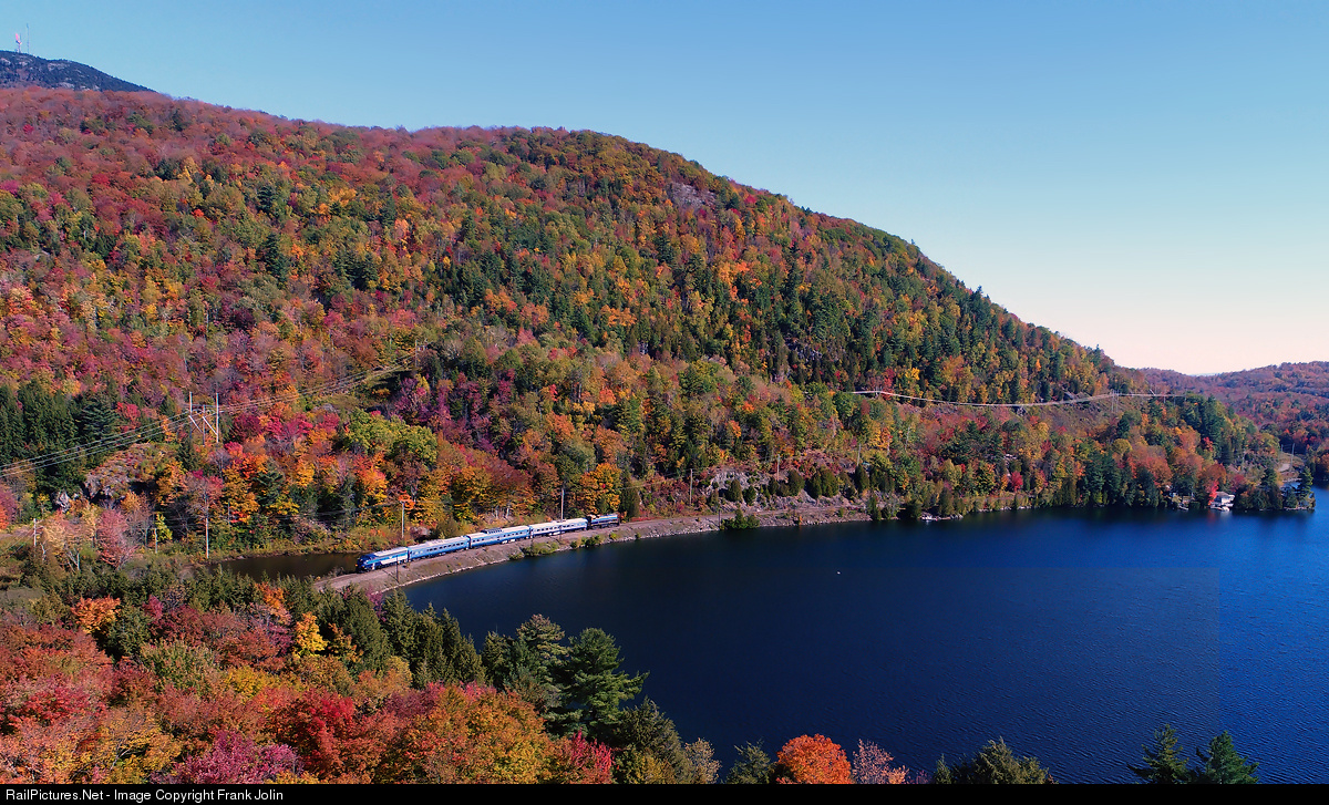 | The Orford Express skirts the rugged shores of Lake Orford below the mountain bearing the same name (Mt Orford). Consist includes FL9 484, RDC-1 6121, Dome-Diner Lounge 310 and RDC-1 6125, MLW M420TR #26 |