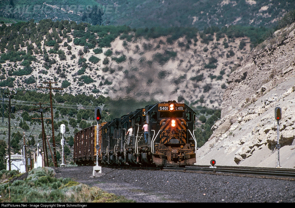 While the engineer remains at the throttle of Rio Grande 5401 East, two other crewmen inspect the power. The manifest has just passed the west end of Gilluly, where curvature and a steep grade put mountains of stress on the locomotives.