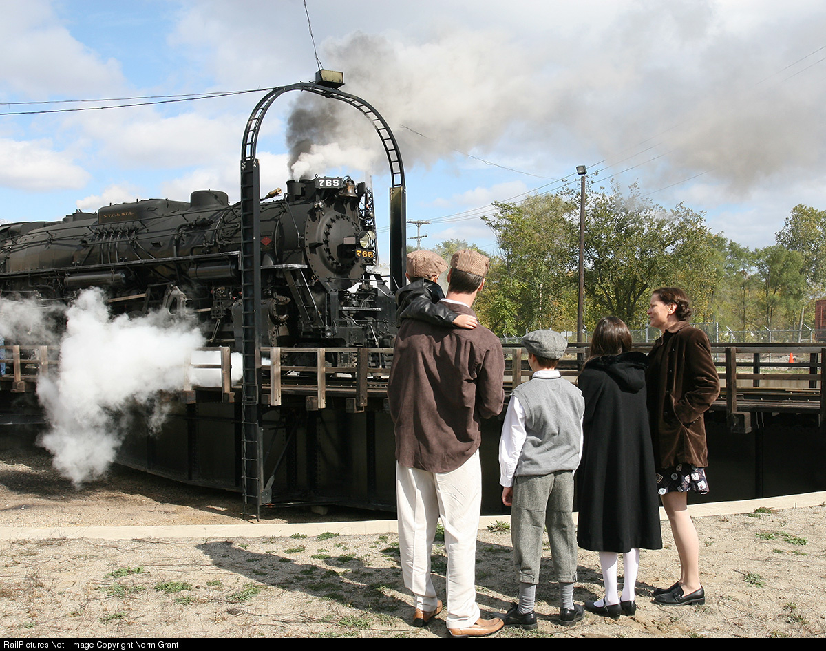 | Nickle Plate Berkshire #765 pulls onto the Owosso turntable after servicing, while a familty in period costume looks on.