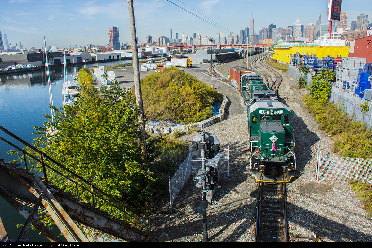 New York & Atlantic Railway's RS-20 shoves a boxcar of rice into New Yung Wah Trading at Wheelspur Facility in Long Island City. Both of NYAR's PR20B locomotives sport a pink ribbon on their nose in support of Breast Cancer Awareness Month.