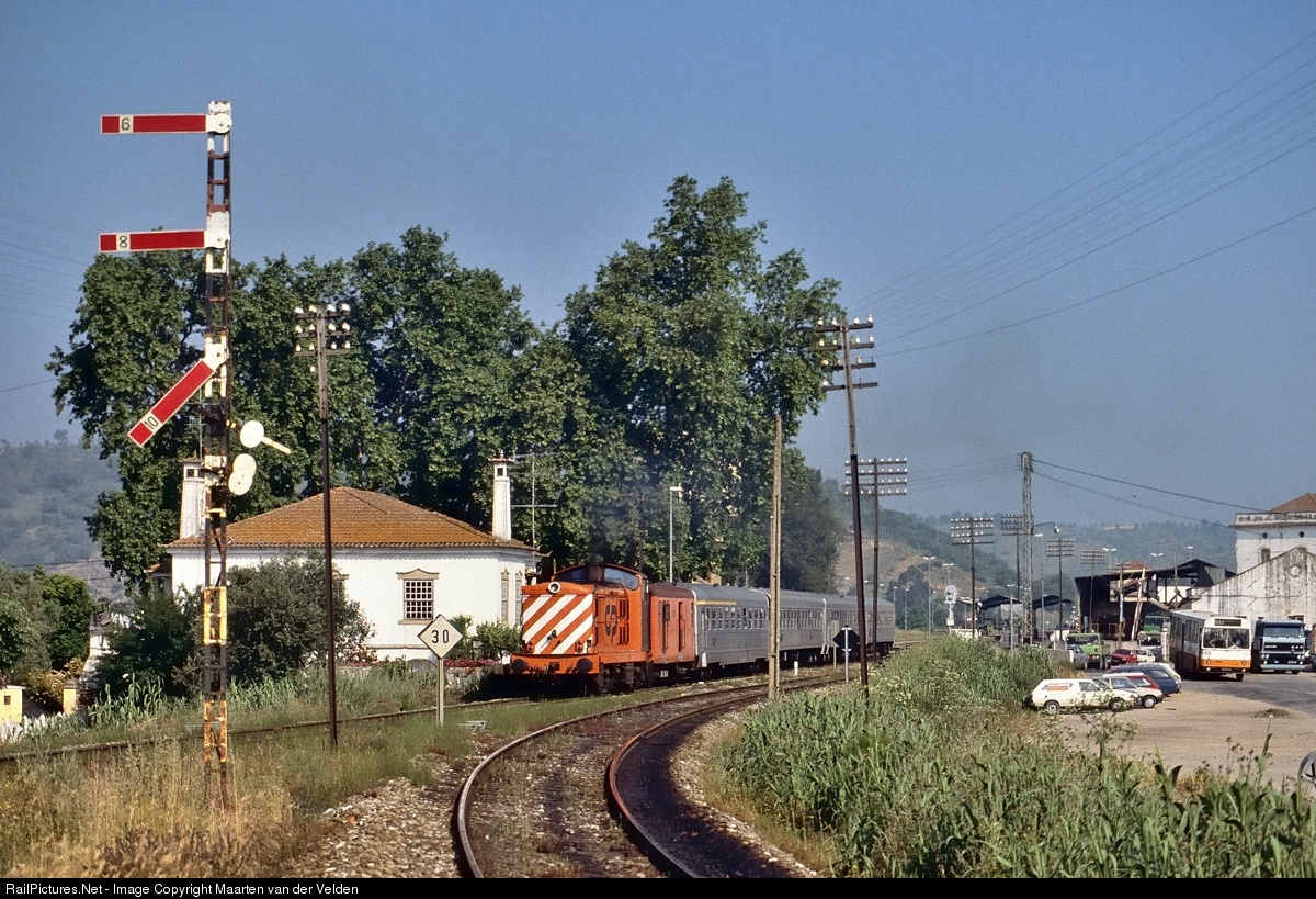 | CP 1458 with Regional 5505 from Entroncamento to Torre das Vargans has just left Abrantes and passe yet one of the entrance signals of the station. The track on the right is the Linha da Beira Baixa, to Castelo Branco and Covilhã.