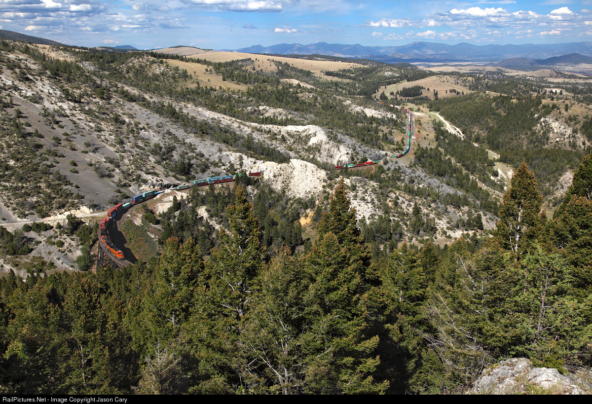 A westbound stack train claws at the 2.2% grade across skyline Trestle. This rock out cropping has long been a favorite place to spend a lazy summer afternoon.... You can watch trains here for a good 30 - 45 minutes here as they battle for the Continental Divide!
