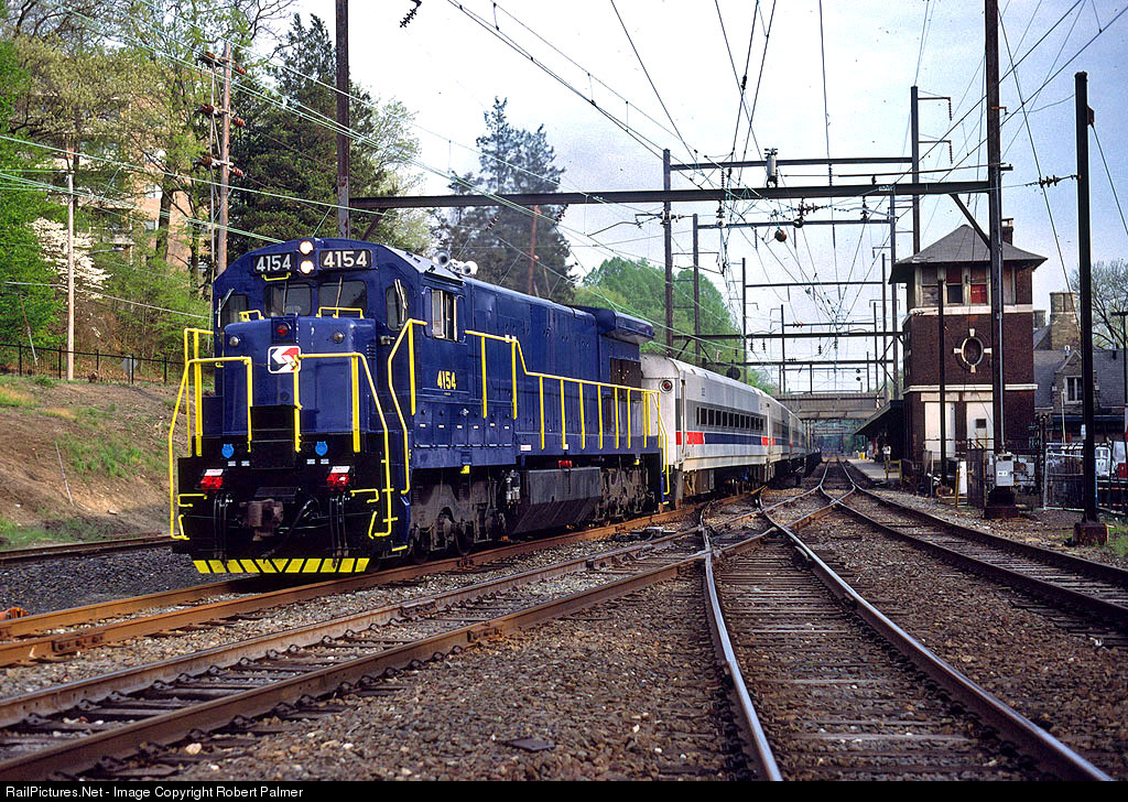 A blue U34CH. In 1993, SEPTA acquired a pair of ex Erie Lackawanna U34CH units from NJ Transit. They were used to provide extra service during a major rail construction project. One of the 2 units (#4154) was given a coat of blue paint. It's pictured here at Jenkintown with a West Trenton train.