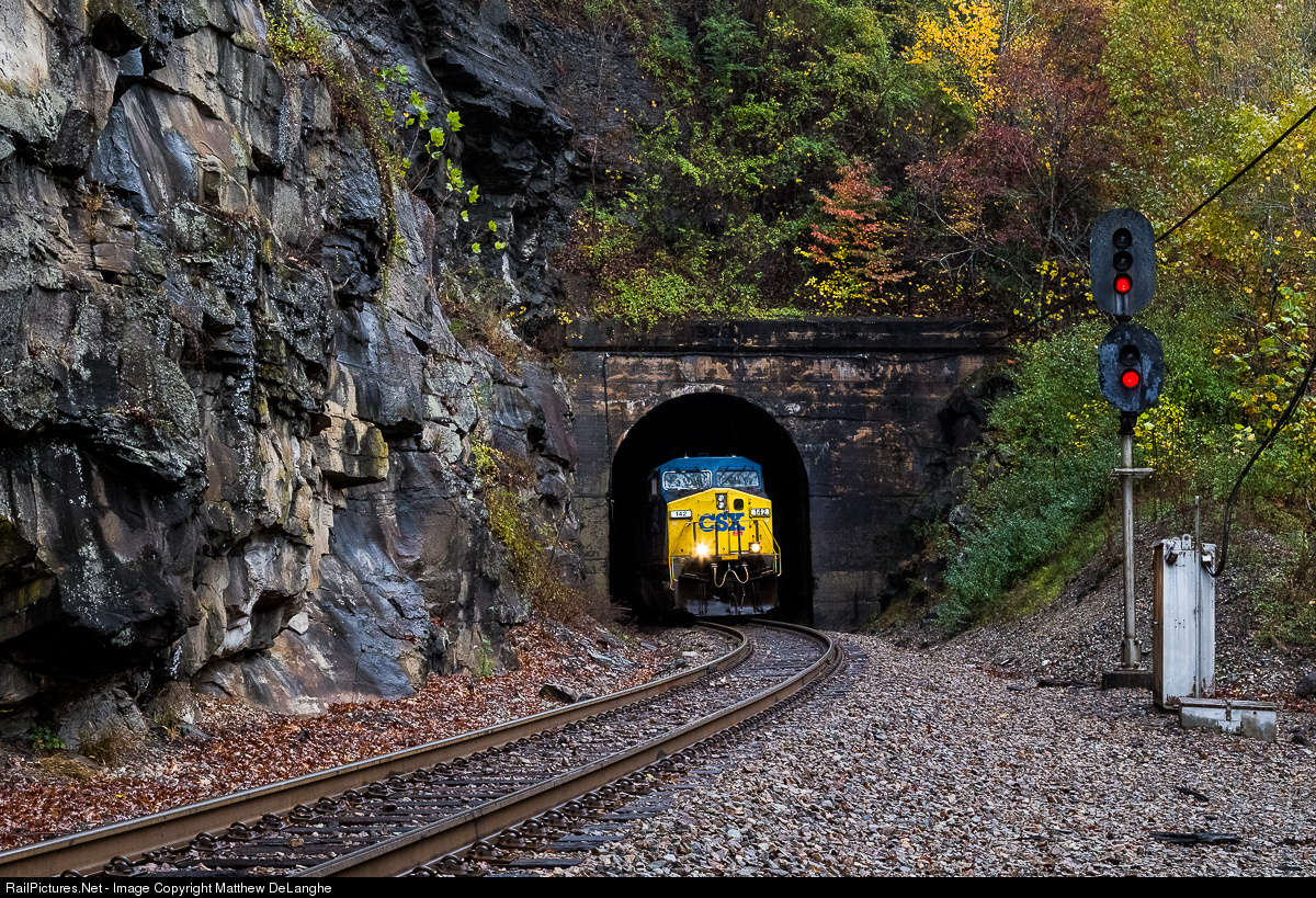 CSXT 142 emerges into a gloomy, rainy Sunday morning from one of the multiple tunnels on the CRR.