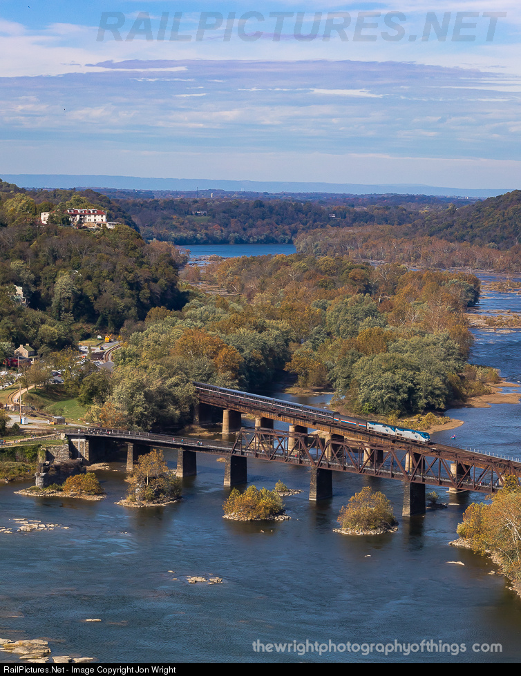 This view from Split Rock atop Loudoun Heights overlooking Harpers Ferry, WV and the Potomac Shenandoah Water Gap through the Blue Ridge Mountains on this absolutely gorgeous Fall day. Amtrak's eastbound Capitol Limited just made it's stop and is in the final leg of it's journey that began last night in Chicago on the way to Washington DC. |