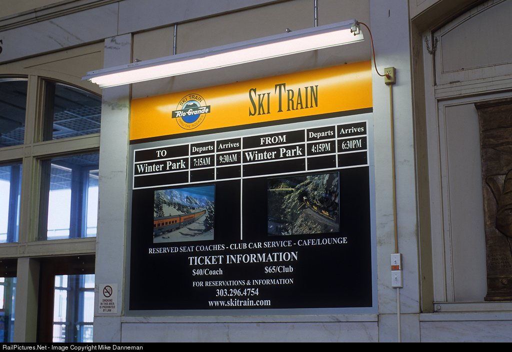 This lighted sign once graced a wall inside Colorado’s Denver Union Station advertising Ansco’s Rio Grande Ski Train operation from Denver to Winter Park, photographed on March 1, 2001.