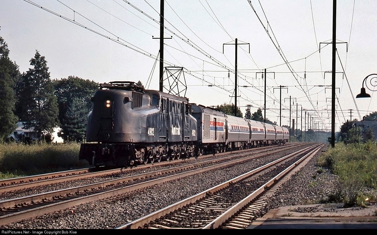 Change is coming to the NEC in the late 70s- concrete ties on No. 4 track, and GG-1 No. 902 has been renumbered as the 4902 to make way for the 900-series AEM-7s. Note the HEP (head end power) car behind the 4902, supplying 480 volts AC to the Amfleet cars. The 4902 was built by Altoona-Westinghouse in May, 1940 as the PRR 4899. PRR fans will also note the classic gooseneck platform lamp, on the right.