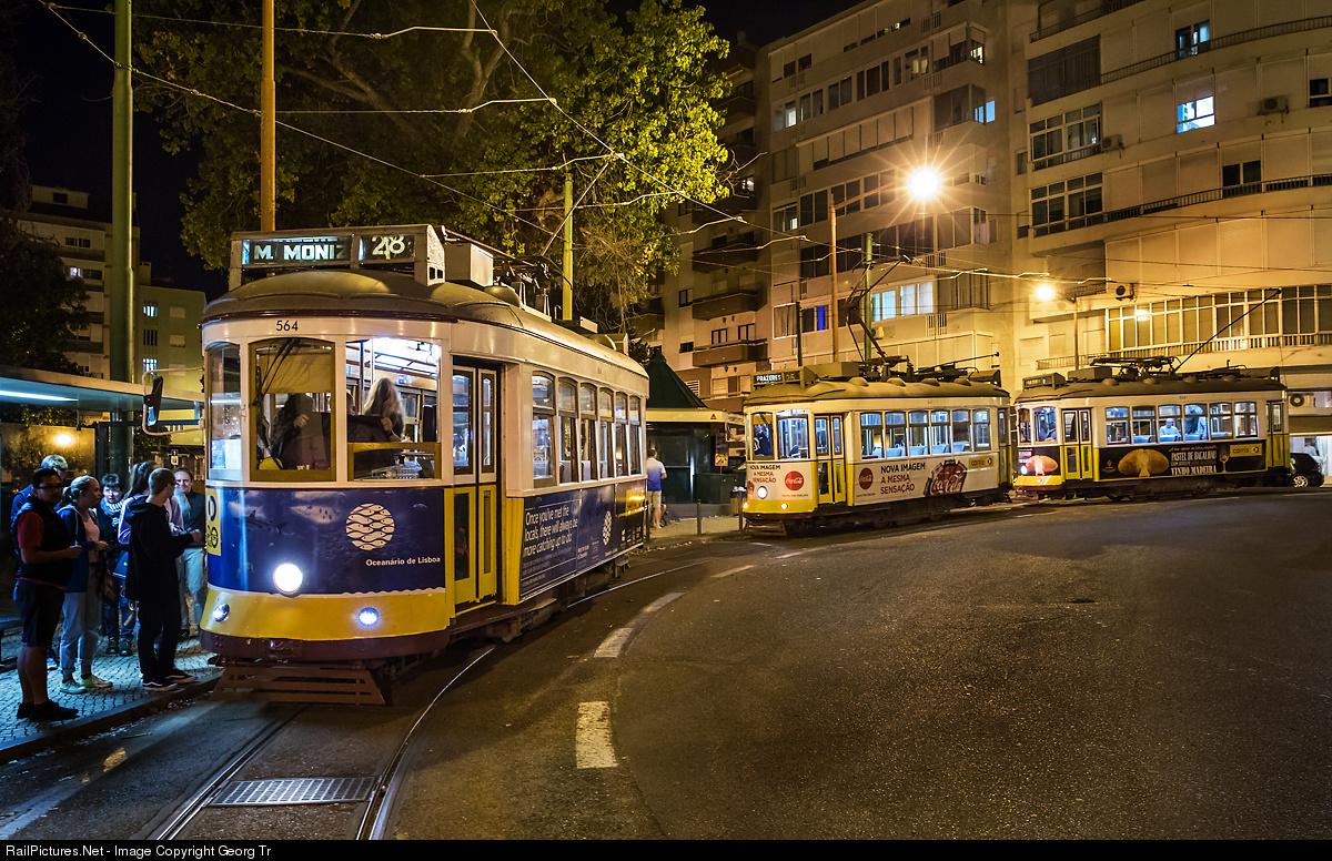 Vintage streetcars # 564, # 547 and # 555 of Carris, the tram system of Lisboa (Eléctricos de Lisboa), on the line 28 and 25 at Campo Ourique (Prazeres). They are of the "Remodelado" type, built between 1935 and 1940 and completely rebuilt with new electric system from Kiepe and new frames from MAN between 1995 and 1996.