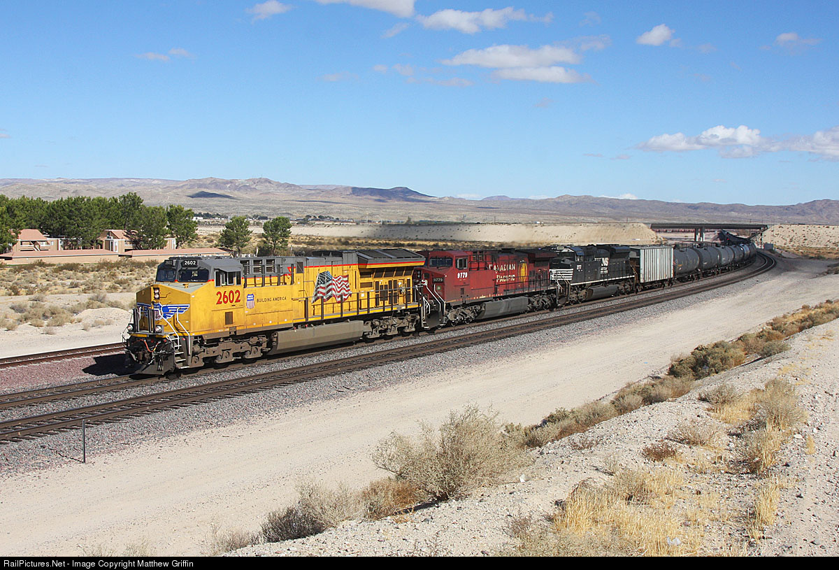 Passing through West Barstow, UP 2602 leads a CP and NS unit on a loaded Ethanol train.
