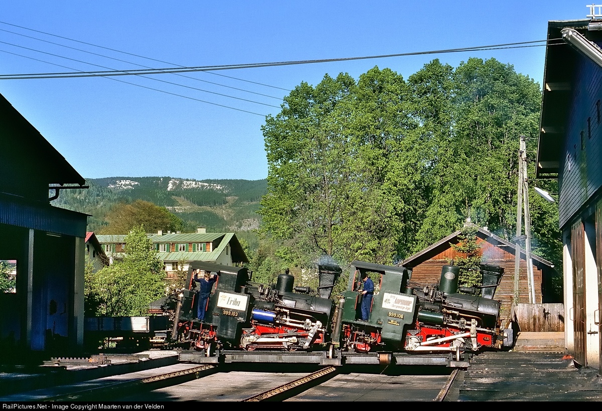 ÖBB 999.106 and 999.103 on the traverser of the shed of Sankt Wolfgang. These cogwheel locomotives were prepared for the next service on the Schafbergbahn. Nowadays this line is served by the Salzburger Lokalbahnen instead of ÖBB.