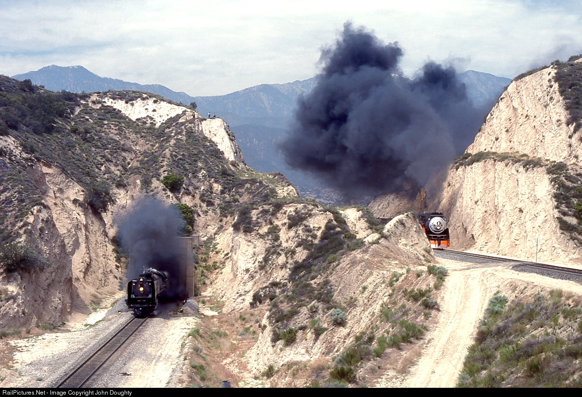 OH BOTH! That is what people were yelling as both SP 4449 and UP 8444 showed up at the same time at Tunnel #1 on Cajon Pass. We could see the smoke plume from SP 4449 as it came around the corner and entered the cut above the tunnel. We had no idea where UP 8444 was until it popped out of the tunnel. A great race and show, but soon SP 4449 had to stop due to an overheated bearing. Yes, the sound was amazing!