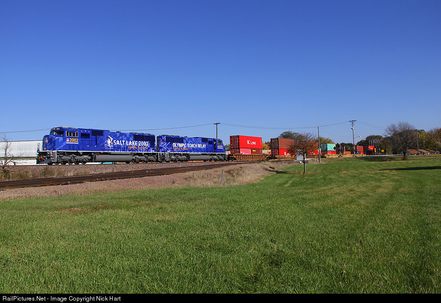 | On a perfect day in Rochelle, the UP's Olympic units lead IG2G2 west on the approach to Global 3. 2002 and 2001 were recently repainted at NRE in Mount Vernon and look fantastic! |